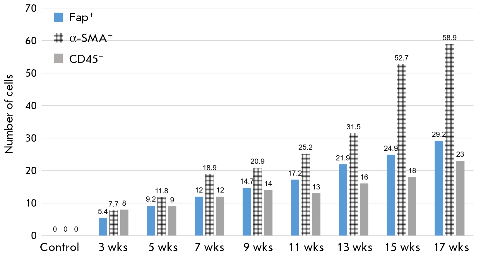 Starting from week three, the number of cells bearing these markers increased, and the number of α-SMA+-, CD45+ cells began to exceed that of FAP+-cells (Fig. 4). At the 5th week, the number of cells carrying the target markers increased while the gap between the FAP+ and α-SMA+ cells narrowed, and the increase in CD45+ cells became minimal. Then, the situation with FAP+- and α-SMA+-cells repeated itself in the 7th and 9th weeks. In the 7th week, the increase in the number of α-SMA+ cells, in percentage terms, was more pronounced, while in the 9th week the gap between the number of FAP+ and α-SMA+ cells had narrowed again. The number of CD45+ cells grew as well, but, as fibrosis progressed, its rate dropped, making this parameter a minor one in growth-rate terms. From the eleventh to the thirteenth weeks, while transition from fibrosis to cirrhosis was under way, the gap in the growth rate of FAP+- and α-SMA+-cells again appeared, in addition to which a slight decrease in the number of CD45+-cells was recorded. Despite the observed increase, their share at the 15th and 17th weeks remained the lowest when compared to the FAP+- and α-SMA+-cells, while the number of α-SMA+ cells had increased rapidly. At all time, a statistically significant strong correlation was found between the area of connective tissue and the number of FAP+-, α-SMA+-, and CD45+-cells.
