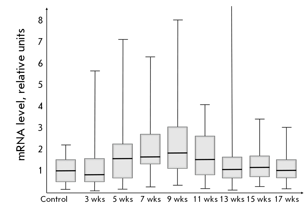 The analysis included all values obtained within the study, not excluding the “outliers” with a low level of mmp-9 mRNA observed at the control point (intact rats). It is noteworthy that by the 3rd week into the experiment, in the presence of developing fibrosis, the relative mmp-9 level did not increase and even slightly decreased when compared to the control value. At the same time, it increased over a relatively short interval between the 5th and 9th weeks to subsequently drop to its initial level. In the presence of increased mmp-9 mRNA expression, the fibrosis to cirrhosis transition occurred. Starting from the 11th week, the level of mmp-9 mRNA began to drop and, as a result, already from the 13th to 17th weeks, it had matched the initial one at the control point.
