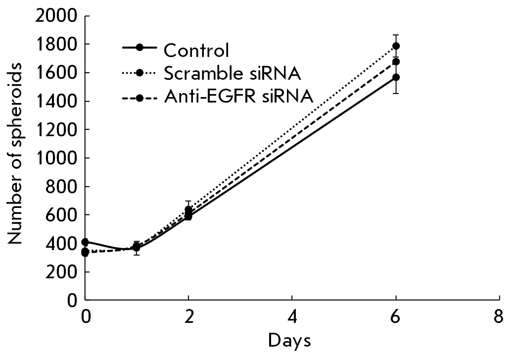 The data obtained suggest that suppression of EGFR by specific siRNAs at the spheroid assembly stage leads to a decrease in the rate of spheroid formation in a MCF7-EGFR culture. At the same time, suppressing EGFR in mature spheroids does not lead to their destruction.