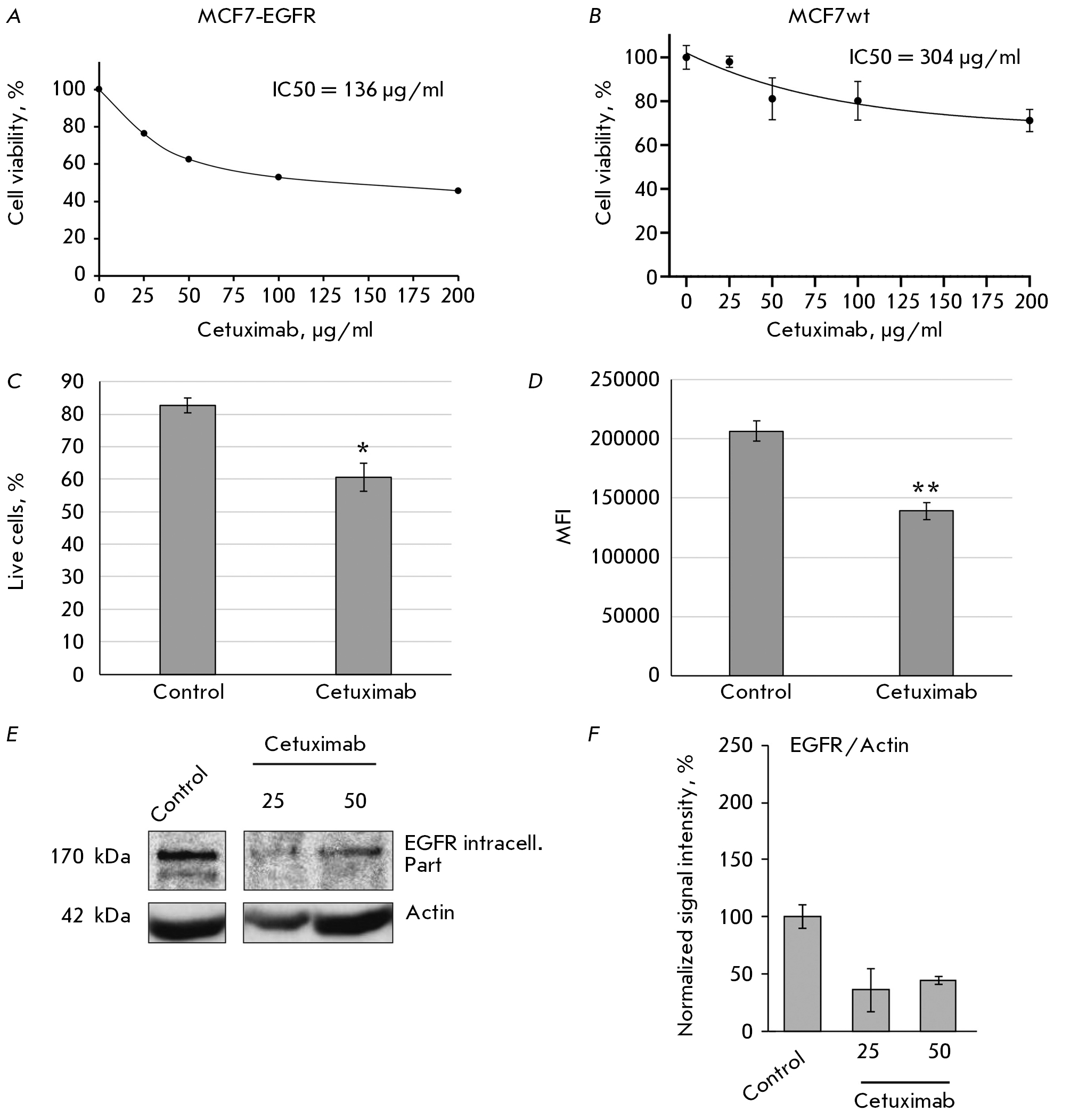 Fig. 4. The cytotoxic activity of cetuximab against MCF7-EGFR spheroids (A) and wild-type MCF7 cells (B). The IC50 values were determined by the MTT assay. (C, D) – the estimation of the proportion of live MCF7-EGFR spheroid cells after cetuximab treatment by flow cytometry. The MCF7-EGFR cells were incubated with cetuximab (50 µg/ml) for 72 h and stained with FDA. (C) the mean % of live cells ± SD of two independent experiments. (D) MFI, the mean fluores- cence intensity of live cells. The differences were significant at *p < 0.05, ** p < 0.01. (E, F) the changes in the EGFR levels after cetuximab treatment. MCF7-EGFR spheroids were dissociated and treated with cetuximab (25–50 µg/mL) for 48 h. (E) the representative images of the Western blot analysis. (G) the Western blot analysis of EGFR/actin in the cells