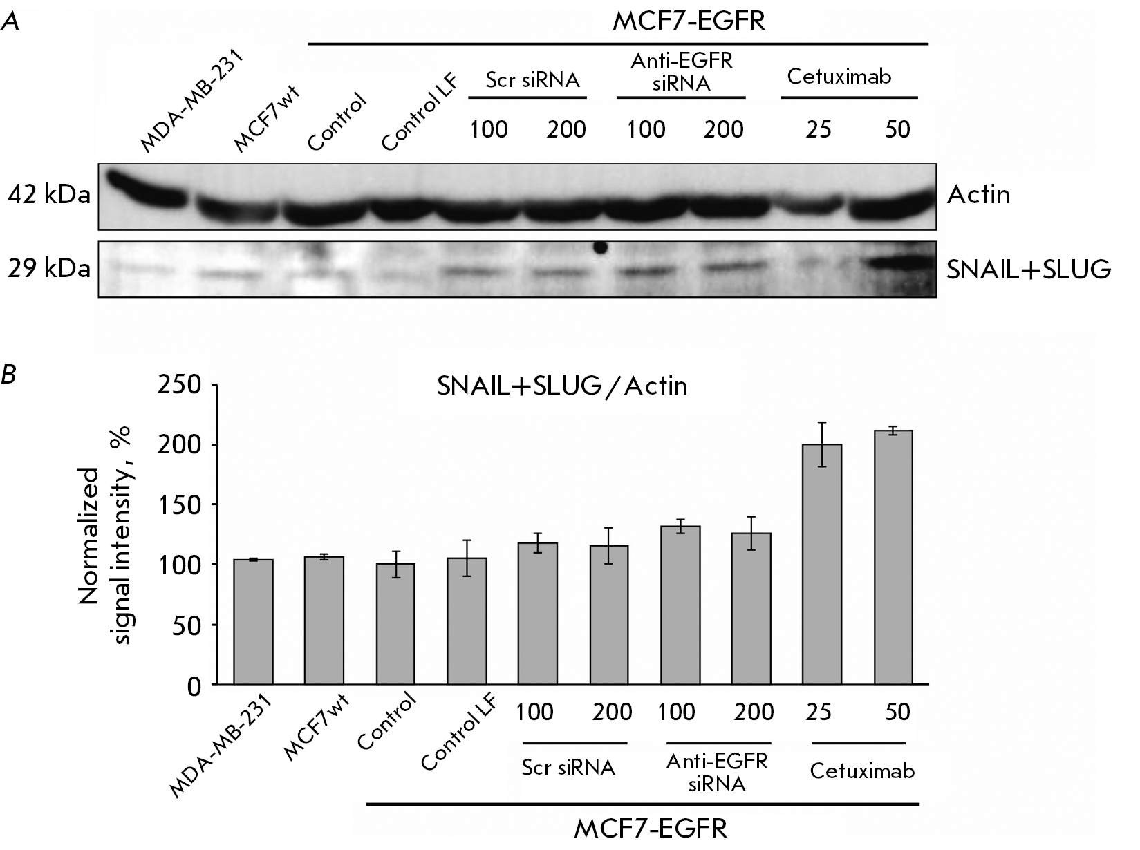 Fig. 8. The changes in cellular proteins after the anti-EGFR siRNA and cetuximab treat- ment. MDA-MB-231, MCF7wt were used as control cell lines. The MCF7-EGFR spheroids were dissociated and treated with Scramble siRNA, anti-EGFR siRNA (100–200 nM), or ce- tuximab (25–50 µg/ml) for 48 h. (A) the rep- resentative pictures of the Western blots analysis. (B) the West- ern blots analysis of SNAIL+SLUG/Actin in the cells