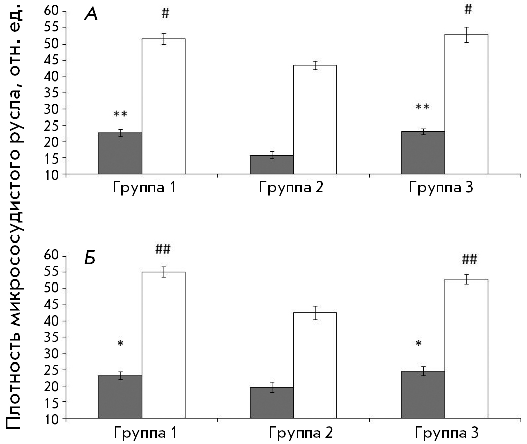 По горизонтали – группы экспериментальных животных; по вертикали – показатель плотности микрососудистого русла (число сосудов/единицу площади).