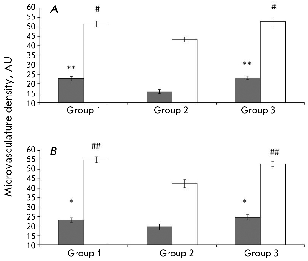 Horisontally – experimental animals groups; vertically – indicator of the microvascular bed density (number of vessels / unit area).