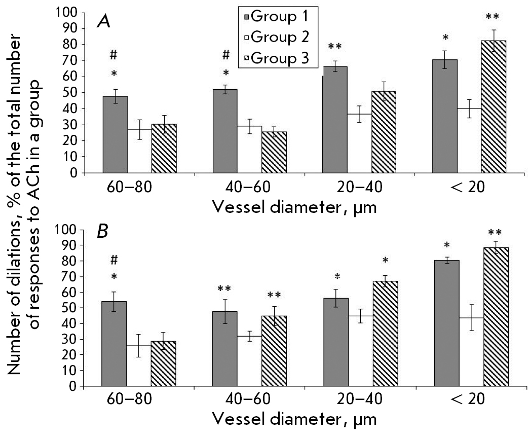 Horizontally – vessels diameter, vertically – number of vessels dilated in response to ACh, % of the total number of reactions to ACh in the group.