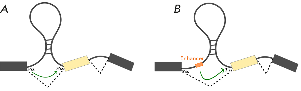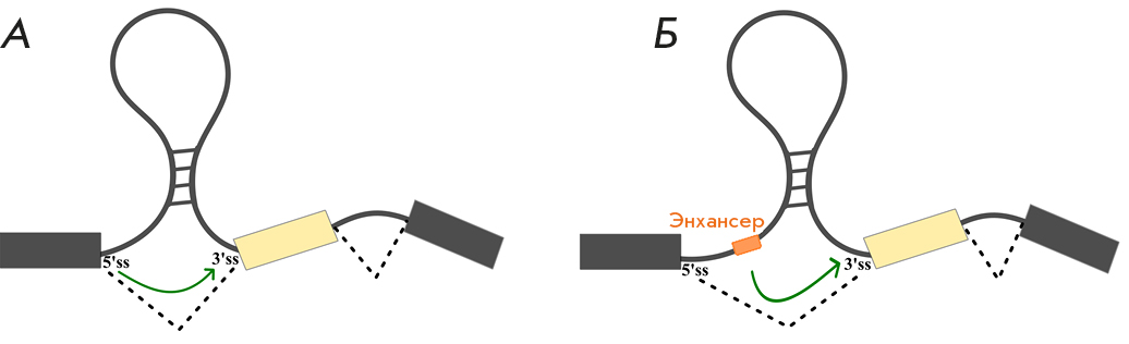 Рис. 2. Сближение цис-регуляторных элементов сплайсинга структурой РНК (РНК-«мосты»). Сближение сайтов сплайсинга (А). Приближение энхансера сплайсинга к сайту сплайсинга (Б)