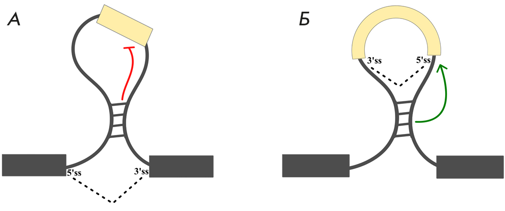 Рис. 3. Отдаление цис-регуляторных элементов сплайсинга структурой РНК (выпетливания). Выпетливание участка, содержащего один или несколько экзонов и интронов (А). Обратный сплайсинг в интроне, приводящий к образованию кольцевой РНК (Б). Красными и зелеными линиями обозначено активирующее и ингибирующее действие на сплайсинг соответственно