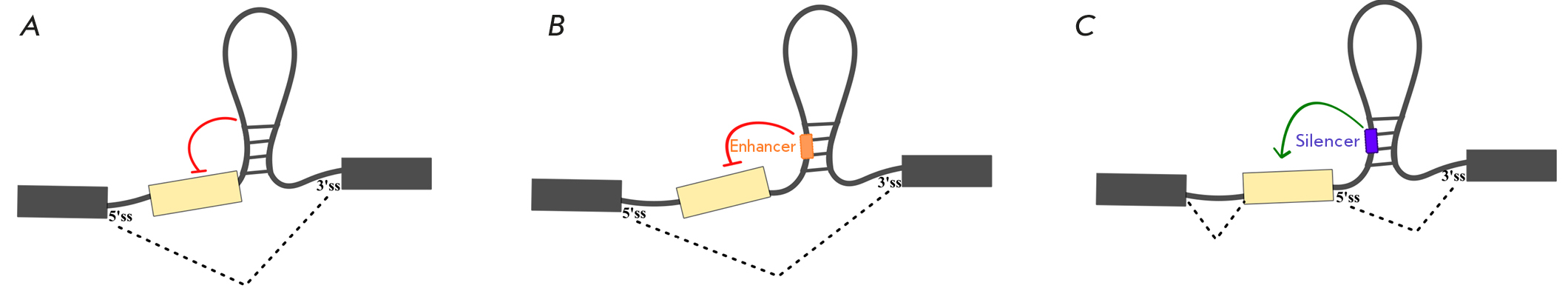 Рис. 1. Блокировка цис-регуляторных элементов сплайсинга структурой РНК. Блокировка сайта сплайсинга (А). Блокировка интронного энхансера (Б). Блокировка интронного сайленсера сплайсинга (В). Красными и зелеными линиями обозначено активирующее и ингибирующее действие на сплайсинг соответственно