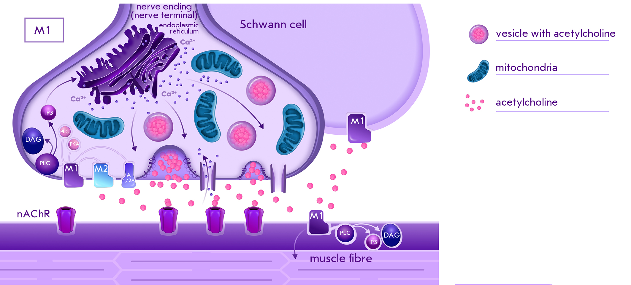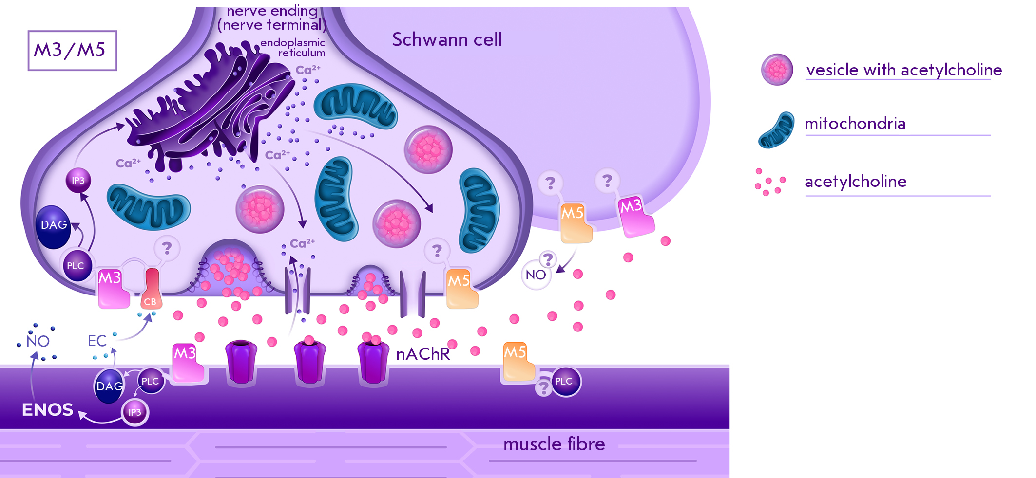 Thus, different mAChR subtypes ensure the functionality of the tripartite synapse (nerve ending – muscle fiber – Schwann cell) and coordinate the development and morphological properties of the synapse with its activity.
