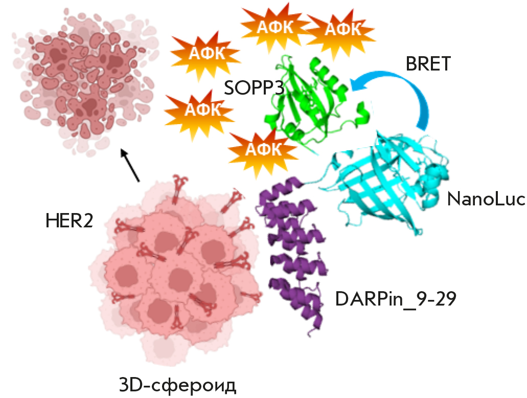 В данной работе мы предлагаем использовать мультимодальный адресный белок DARP-NanoLuc-SOPP3, который содержит не только BRET-пару NanoLuc-SOPP3, но и адресный модуль DARPin, обеспечивающий тропность данного белка к опухоль-ассоциированному антигену рака молочной железы и яичников человека. На модели 3D-сфероидов показано, что DARP-NanoLuc-SOPP3 может использоваться для адресной BRET-индуцированной ФДТ. Схема эксперимента представлена на рис. 1.