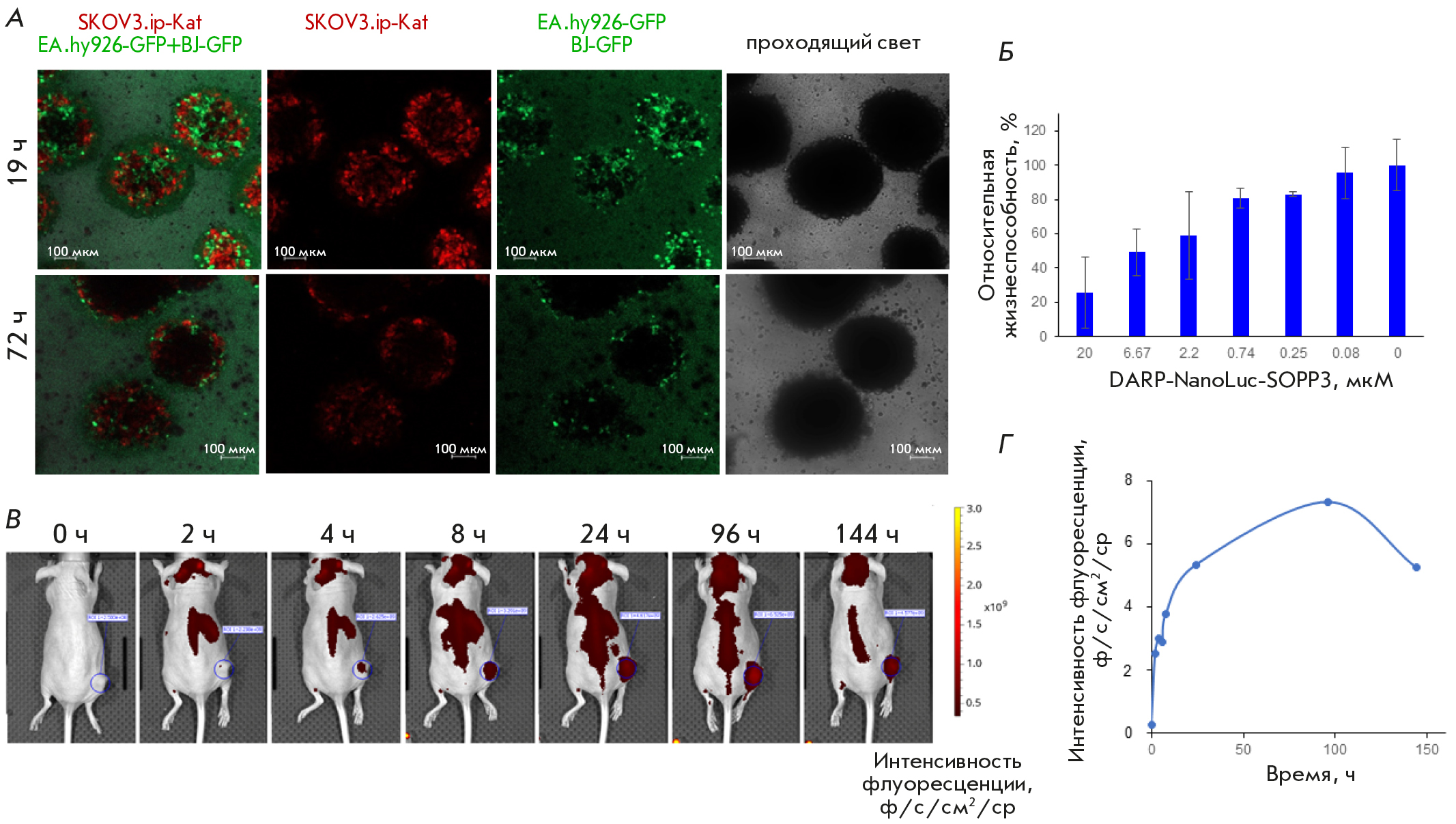 Рис. 4. BRET-индуцированная цитотоксичность DARP-NanoLuc-SOPP3 в 3D-культуре и биораспределение in vivo. А – конфокальные изображения сфероидов (SKOV3.ip-Kat, EА.hy926-GFP и BJ-5TA-GFP) после инкубации в течение 19 и 72 ч с DARP-NanoLuc-SOPP3 (300 мкМ). Б – BRET-индуцированная цитотоксичность DARP-NanoLuc-SOPP3 в отношении сфероидов, сформированных из клеток аденокарциномы яичника и клеток стромы. В – распределение DARP-NanoLuc-SOPP3-Cy5.5 в организме мыши с ксенографтной подкожной HER2-положительной опухолью (обведена синей пунктирной линией) на основе клеток SKOV3. Г – зависимость интенсивности флуоресценции (выражена в фотонах в секунду на см2 на стерадиан) от времени. График построен на основании данных, соответствующих средней яркости области опухоли на рис. В (синяя пунктирная линия) в определенный момент времени