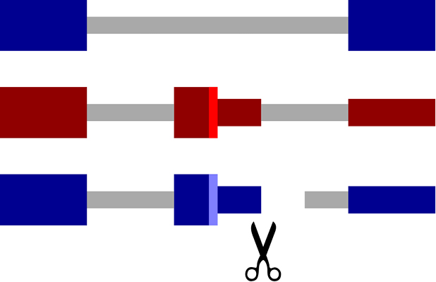 Fig. 4. Alternative polyadenylation promotes NMD escape by cutting off a part of the UTR that contains EEJ. This converts a PTC into a normal stop codon (bright vertical blue line)