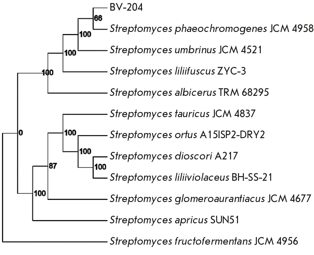 The results of full-genome sequencing and subsequent assembly demonstrated the genome size of BV-204 cells to be typical for representatives of the genus Streptomyces [30] and comprised 11,380,121 bp at the G+C content of 70.2%. Phylogenetic analysis showed that BV-204 clustered most closely with S. phaeochromogenes JCM 4958 (formerly S. ederensis JCM 4958) and together with it, as well as with S. umbrinus JCM 4521, S. liliifuscus ZYC-3, and S. albicerus TRM 68295, formed a monophyletic group with a maximum branching support value of 100% (Fig. 1).