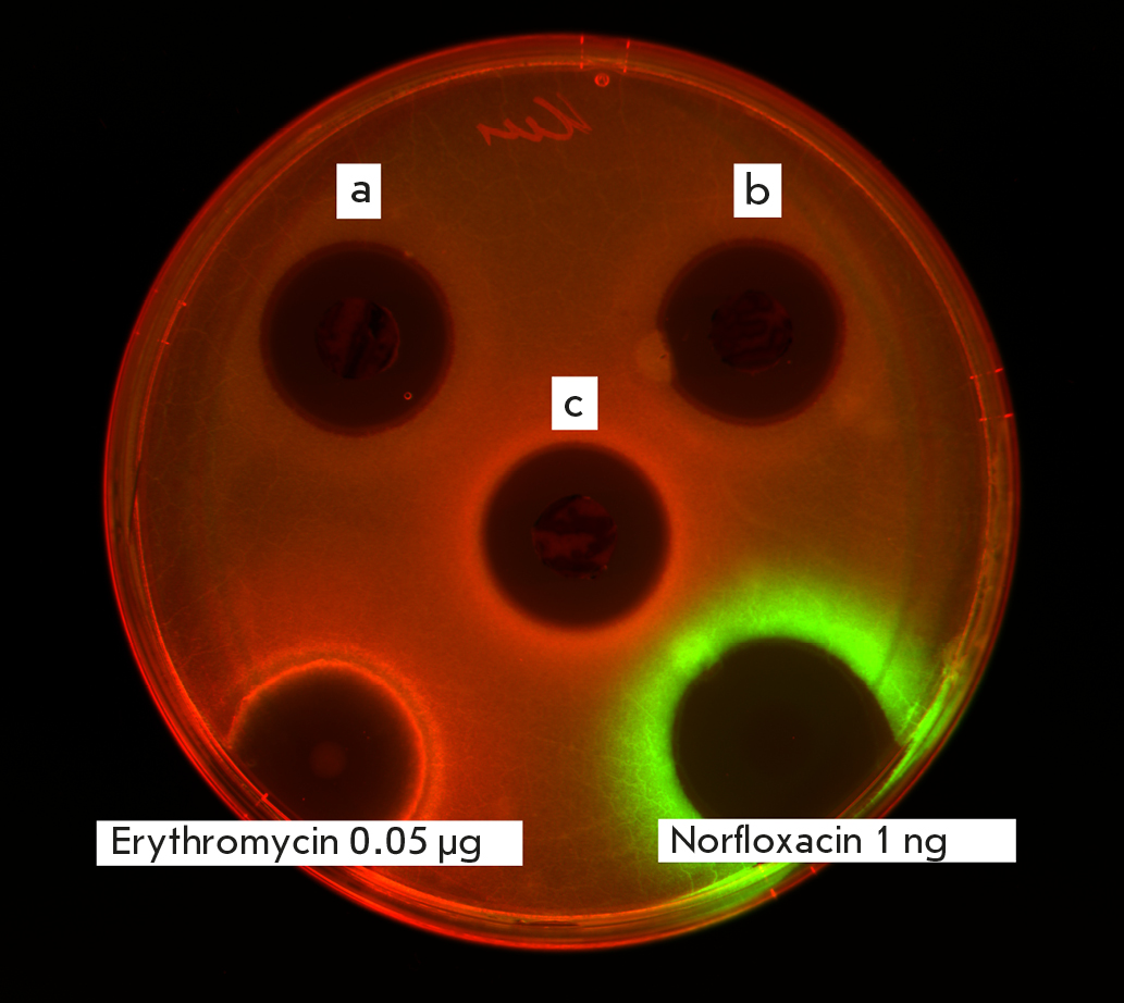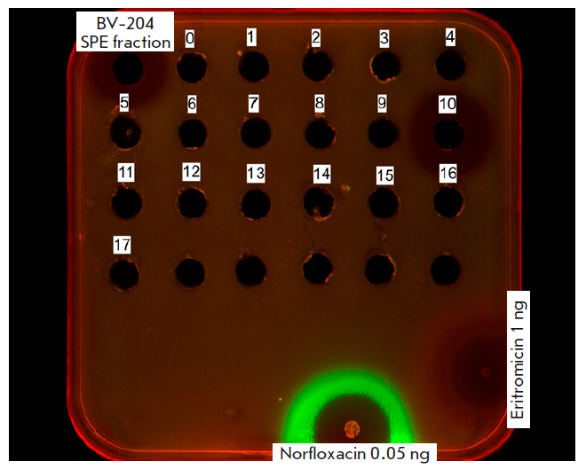 Initial screening revealed the strain’s antibacterial activity against E. coli SS_lptd pDualrep2. The substance secreted by the producer induced Katushka2S expression that could possibly inhibit protein synthesis (Fig. 3). As positive controls, we used 0.05 μg of erythromycin (protein biosynthesis inhibitor) inducing Katushka2S expression, and 1 ng of norfloxacin (DNA gyrase inhibitor) inducing TurboRFP expression. For convenience, the Katushka2S and TurboRFP signals were visualized in respective red and green by the ChemiDoc MP software. In E. coli JW5503 ΔtolC pDualrep2 no inhibition or induction of reporter fluorescent proteins was registered.
