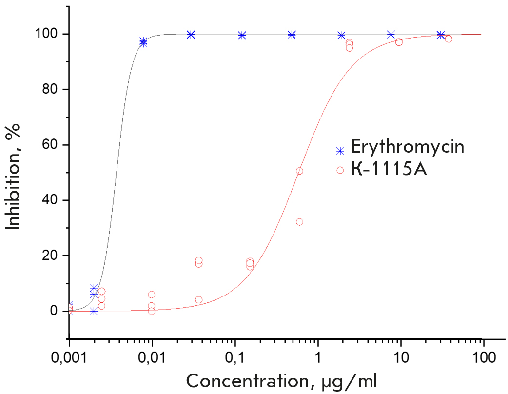 The ability of the HPLC-purified fraction of K-1115A to inhibit cell-free translation was investigated with erythromycin used as a reference translation inhibitor. The experiments were carried out in triplicate; the results of determining the dose-effect concentration dependence are presented in Fig. 5. The EC50 values were 0.004 and 0.606 µg/mL for erythromycin and K-1115A, respectively.