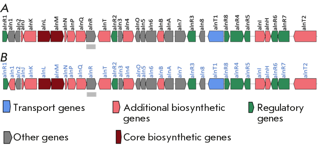 Some products of alnumycin BGC are known to have antibacterial activity [31], but their action mechanism has not been studied yet. Analysis of the reference genome (GenBank RefSeq:GCF_026343615.1) of S. phaeochromogenes NBC 00034 also revealed it to have an alnumycin BGC and conjugated compounds. This cluster had been annotated previously based on Streptomyces sp. CM020 [32], whose phylogenetic attribution data have not been published. However, considering the high homologic and phenotypic similarity of the alnumycin BGCs from Streptomyces sp. CM020, S phaeochromogenes NBC 00034, and S phaeochromogenes BV-204, it can be assumed that Streptomyces sp. CM020 also belongs to the S. phaeochromogenes taxon.