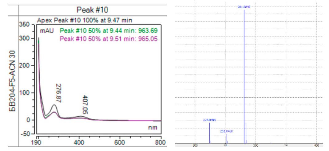 Рис. S12. УФ- и масс-спектр пика ВЭЖХ активного компонента