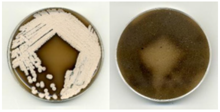 Fig. 3. Activity of the agar blocks containing S. phaeochromogenes BV-204 in the presence of E. coli lptd pDualrep2 on (a) the 3rd, (b) 6th, (c) and 9th days of growth