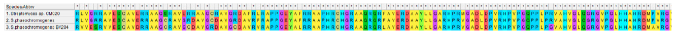According to published data, S. phaeochromogenes NBC 00034 produces various isomers of phaeochromacetin (A, B, C, D, E) [34–38], as well as moenomycin and bambermycin [38], but CMSA did not detect these products in the spectrum of the BV-204 metabolites. It is noteworthy that no alnumycin was detected either. Disruption of the aln4 and aln5 genes can affect alnumycin biosynthesis [34] and transform it to K-1115A as a major product [32]. Gene alignment demonstrated that aln4 in Streptomyces sp. CM020 and S. phaeochromogenes NBC 00034 were fully identical, whereas the nucleotide sequence of the aln4 gene of BV-204 differs from them by several substitutions. The genetic sequences of the aln5 gene in the analyzed strains differ much more strongly (Supplementary, Fig. S9). This is probably the reason why our strain produces only K-1115A.