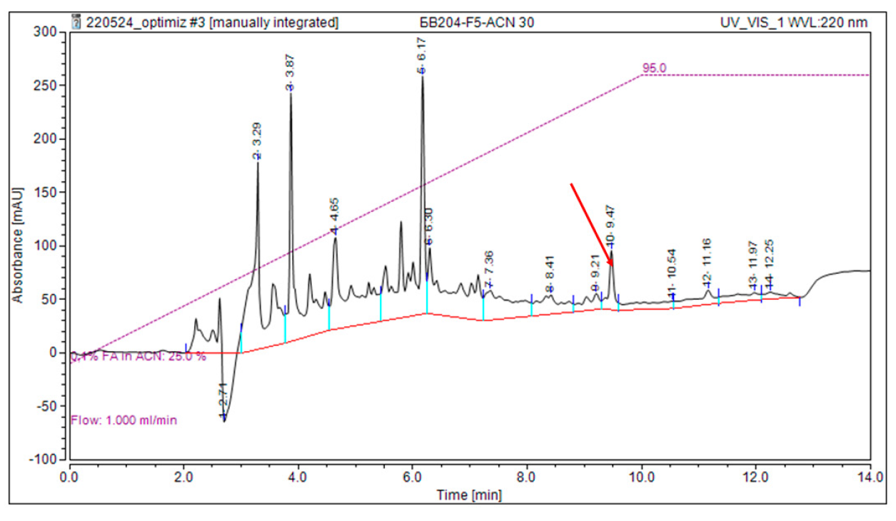 Initial screening established BV-204 ability to exhibit antagonistic activity when grown on the ISP3 medium. To obtain the CF containing the active ingredient, the strain was cultured on a ISP3 liquid nutrient medium (7 days, 28°C in a New Brunswick Innova shaker (Eppendorf) at 200 rpm). The CF was separated from the biomass by centrifugation at 4, 000 g, concentrated and purified by SPE. For this purpose, CF was applied to a Poly-Prep Econo-Pac chromatographic column (Bio-Rad) containing 1 ml of LPS-500H sorbent (Tekhnosorbent, Russia), then eluted with a stepwise gradient of water-acetonitrile (v/v) for fractional collection of the eluate. The antagonistic activity of the collected fractions was investigated, and their active fractions were purified using HPLC.