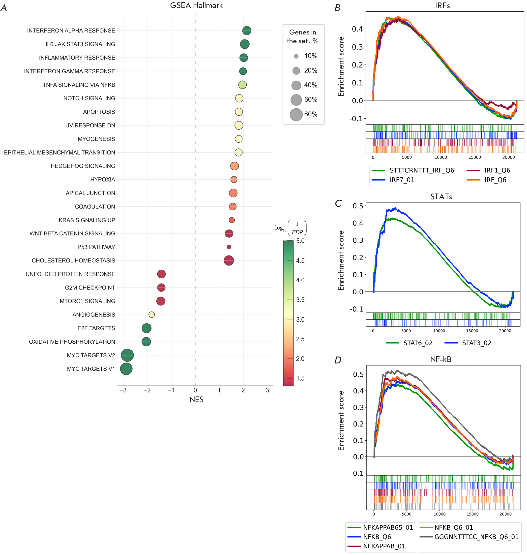 It was shown that of all the sets of the C3 collection (subcollections of TFT:TFT_LEGACY) containing genes binding TF of the IRF family, the sets of genes IRF_Q6 (ES 0.46), STTTCRNTTT_IRF_Q6 (ES 0.46), IRF1_Q6 (ES 0.45), and IRF7_01 (ES 0.45) were significantly (FDR ≤ 0.05) enriched and had a positive enrichment score (ES), which indicates the transcriptional activity of IRF1 and IRF7 factors. When studying sets containing genes with sequences for binding TF of the STAT family, it was found that the sets of STAT3_02 (ES 0.48) and STAT6_02 (ES 0.42) genes were significantly enriched (FDR ≤ 0.05) and had a positive ES, indicating the transcriptional activity of STAT3 and STAT6 factors. A study of the sets containing genes with sequences binding NF-kB showed that the sets GGGNNTTTCC_NFKB_Q6_01, NFKB_Q6_01, NFKAPPAB_01, NFKB_Q6, and NFKAPPAB65_01 were significantly enriched (FDR ≤ 0.05) and had positive enrichment scores of 0.524001, 0.485919, 0.477002, 0.458895, and 0.44804, respectively, indicating an expressed NF-kB-dependent transcriptional activity (Fig. 2A–2D).