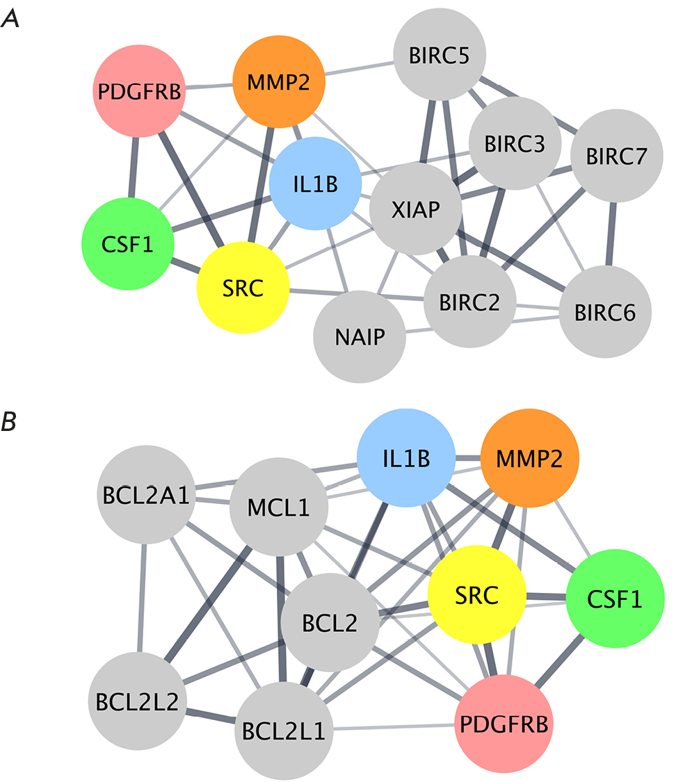 Fig. 5. The discovered IL1B, SRC, PDGFRB, MMP 2, and CSF1 hub genes are connected in PPI networks with antiapoptotic members of the IAPs (A) and BCL-2 (B) families