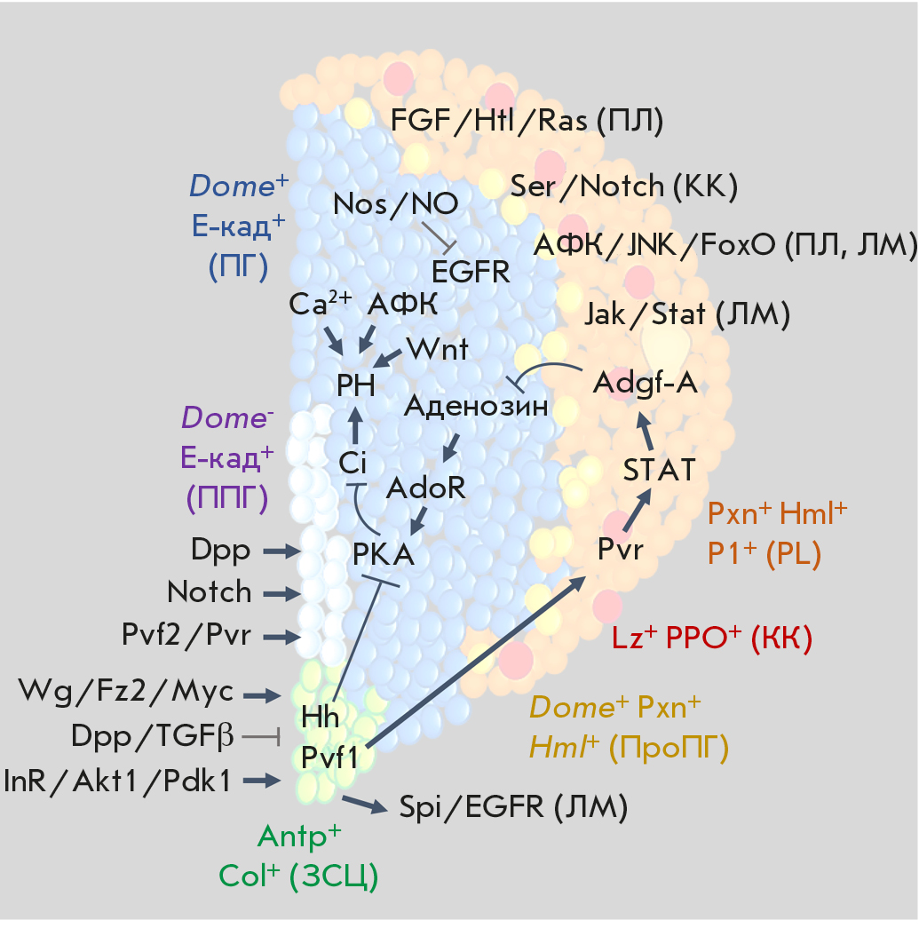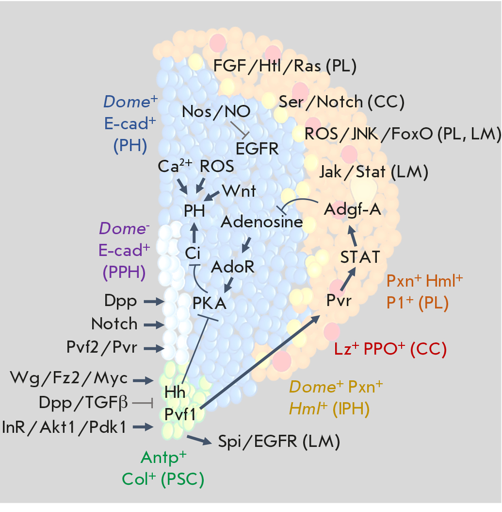 Fig. 2. Schematic representation of the participation and interaction of the main signaling pathways and TFs in the regulation of HO hematopoiesis in the fruit fly. PSC-cell (in green) maintenance and proliferation are positively and negatively controlled by the respective Wg/Fz2/Myc and Dpp/TGFβ signalling pathways. PPH (in grey) maintenance and proliferation are positively controlled by the Dpp, Notch, and Pvf2/Pvr signals. PH (in blue) maintenance (PН, blue) is positively controlled by the Hh/PKA/Ci signals from the hematopoietic niche, autocrine signals Wnt/Fz/Fz2 and Ca2+ and negatively controlled by the Adgf-A signal originating from differentiated CZ hemocytes (in orange). PSC cells positively control Adgf-A expression through activation of Pvr and STAT in differentiated CZ hemocytes, being a link in the equilibrium signals between PSC cells and the mature hemocytes that control PH maintenance. IPHs are marked in yellow. PL differentiation and proliferation is positively regulated by FGF/Htl/Ras and ROS/JNK/FoxO: those of CC, by Ser/Notch; and those of LM, by Spi/EGFR, Jak/Stat, and ROS/JNK/FoxO (see details in the text)