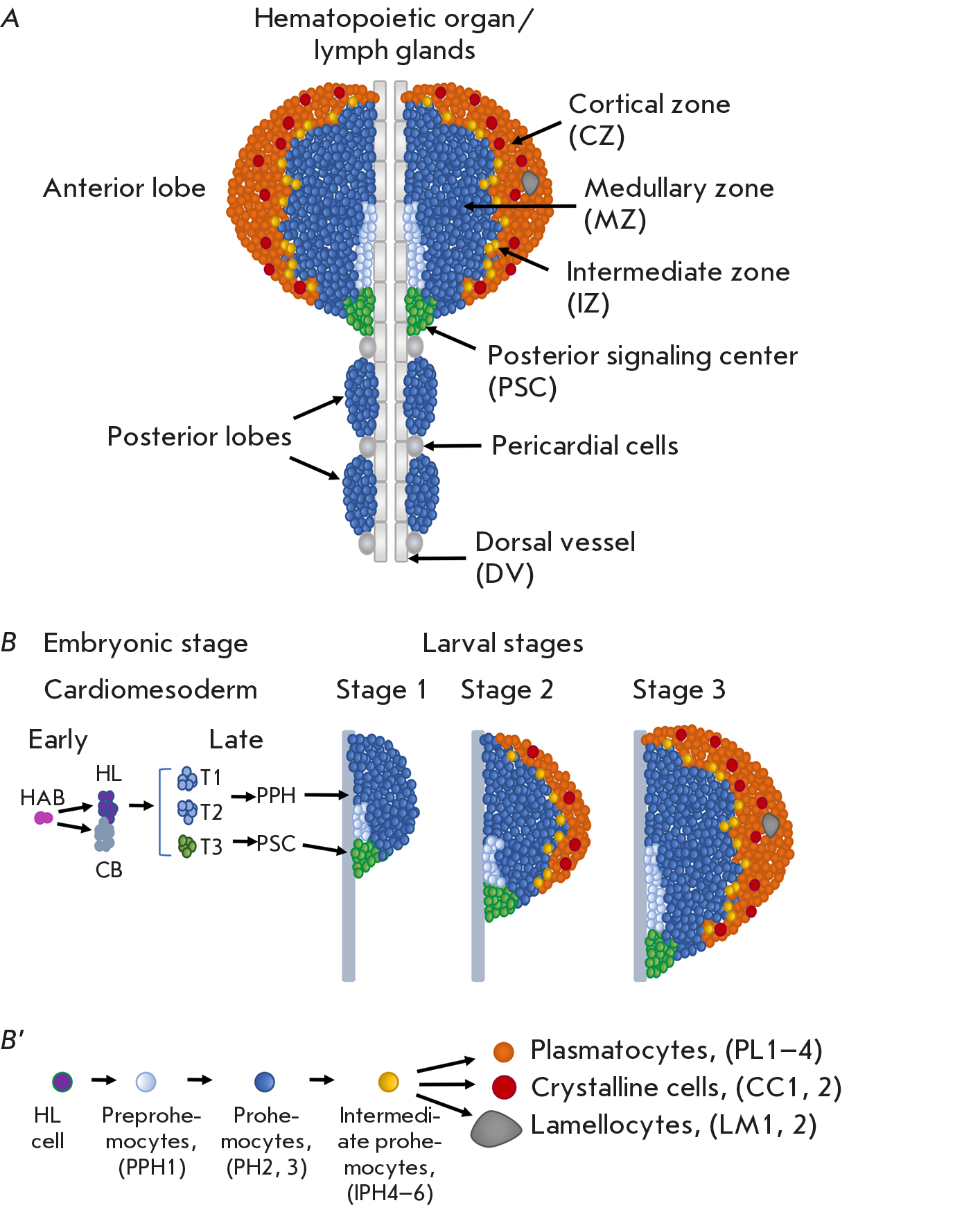 Fig. 1. (A) Drosophila hematopoietic organ (lymph gland of the third larval instar) structure. The HO consists of paired anterior and posterior lobes, attached and interacting with DV and pericardial cells. The anterior lobes of HO are a model system for studying Drosophila hematopoiesis. They consist of cell populations or cellular zones of the PSC (hematopoietic niche); the medullary zone (MZ) involving preprohemocyte (PPH) and prohemocyte (PH) populations; the cortical zone (CZ), consisting of differentiated hemocytes such as plasmatocytes (PLs), crystal cells (CCs), and lamellocytes (LMs); and intermediate prohemocytes (IPHs) of the intermediate zone (IZ). (B) Genesis of hematopoietic organ. At the early embryonic stage, cardiogenic mesoderm cells or hemangioblasts (HAB) give rise to hematopoietic lineage (HL) and cardiovascular precursor cells, cardioblasts (CB). At subsequent embryonic stages, three pairs of thoracic segments (T1–3) of cardiogenic mesoderm produce the HO’s anterior pairs. Two anterior segments (T1–2) fuse and give rise to PPHs and all the hemocytes of the HO anterior lobe, while the third posterior segment produces PSC cells (highlighted in green). At the first instar larva, the anterior lobes contain PPH, PH, and PSC cells. At the second instar larva, PHs begin to differentiate into IPHs, which differentiate into plasmatocytes and CCs, forming the HO’s CZ (these hemocyte lineages are highlighted in colors, as shown on panel B’). At the third larval stage, IPH differentiation into terminally differentiated hemocytes continues, accompanied by CZ growth. At this stage, MZ PHs are maintained in a mitotically quiescent state. (B`) Hematopoiesis occurring in the HO. Hematopoietic progenitor cells and differentiated hemocyte lineages are indicated, and the abbreviations of the subtypes of the hemocyte lineages detected by scRNAseq are shown in parentheses