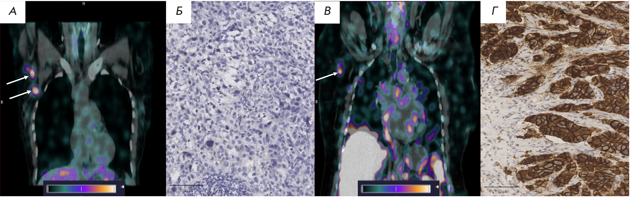 Рис. 2. Накопление препарата [99mTc]Tc-(HE)3-G3 в метастатических аксиллярных лимфатических узлах у больных раком молочной железы через 4 ч после введения: А – накопление препарата [99mTc]Tc-(HE)3-G3 в HER2-позитивных мАЛУ (указано белыми стрелками); Б – ИГХ-картина HER2-позитивного мАЛУ (увеличение 400×); В – накопление препарата [99mTc]Tc-(HE)3-G3 в HER2-негативном мАЛУ (указано белой стрелкой); Г – ИГХ-картина HER2-негативного мАЛУ (увеличение 400×)