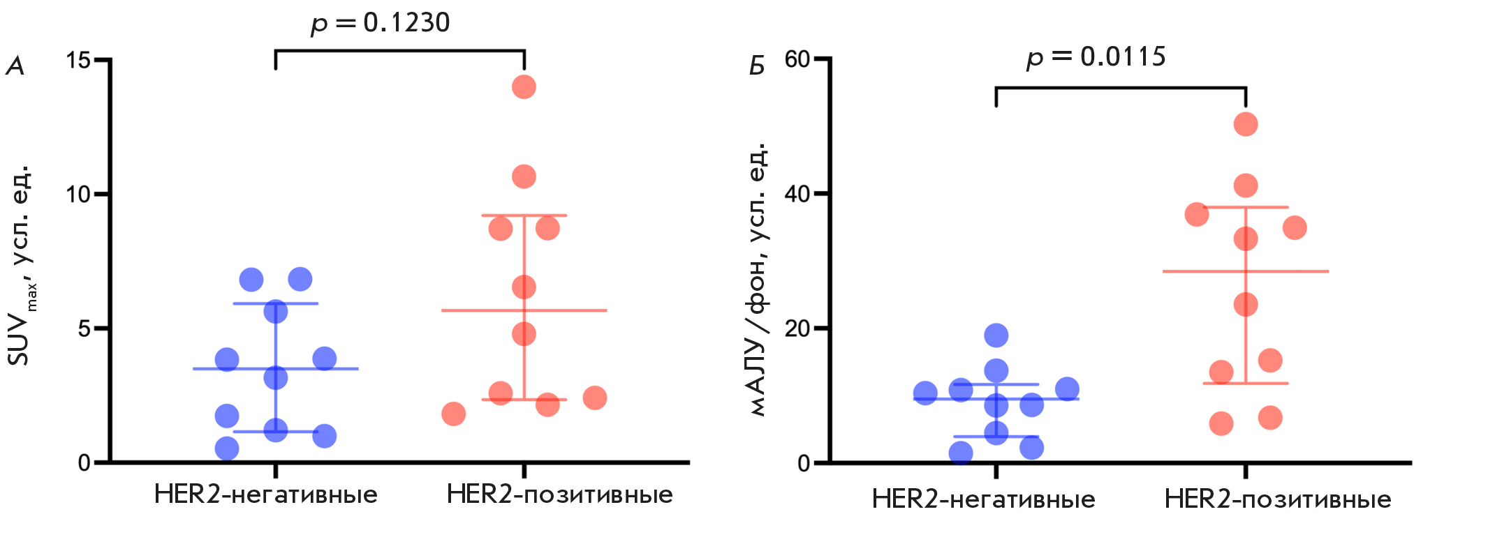 Рис. 3. SUVmax (А) и соотношение мАЛУ/фон (Б) через 4 ч после введения препарата [99mTc]Tc-(HE)3-G3 у больных раком молочной железы с HER2-позитивными и HER2-негативными метастатическими аксиллярными лимфатическими узлами