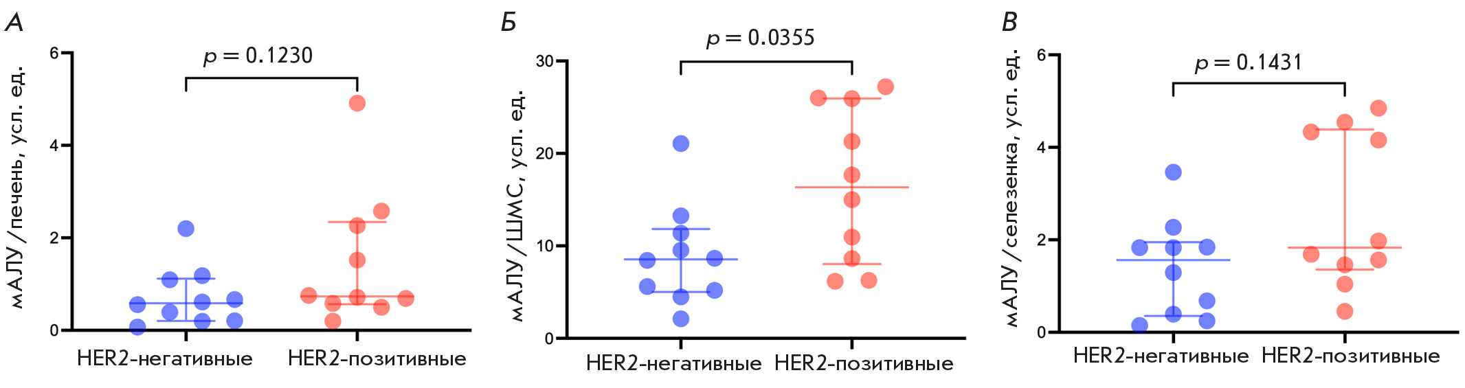 При расчете соотношений мАЛУ/референсные органы оказалось, что показатель мАЛУ/ШМС был выше в HER2-положительных мАЛУ по сравнению с HER2-отрицательными мАЛУ (16.5±8.3 и 8.9±5.4 соответственно) (p = 0.035, Mann–Whitney test) (табл. 1, рис. 4).