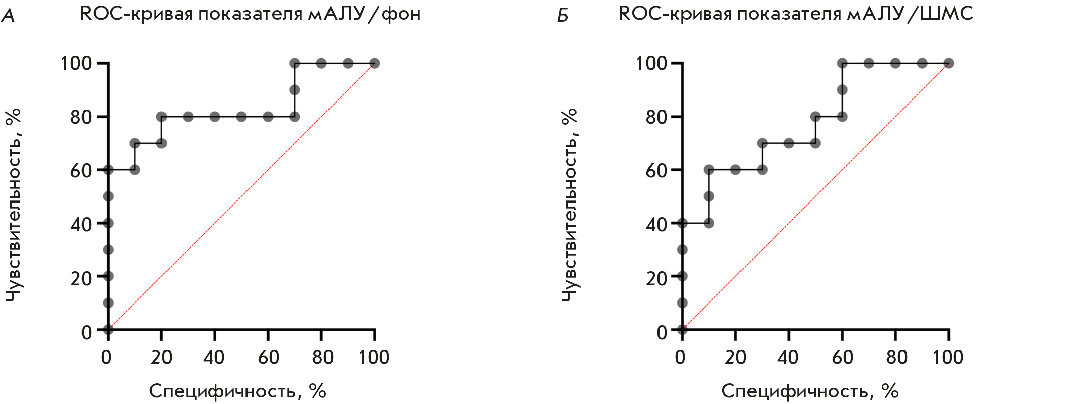 Рис. 5. ROC-кривые соотношений мАЛУ/фон (А) и мАЛУ/ШМС (Б) в определении статуса HER2/neu в мАЛУ у больных раком молочной железы через 4 ч после введения препарата [99mTc]Tc-(HE)3-G3