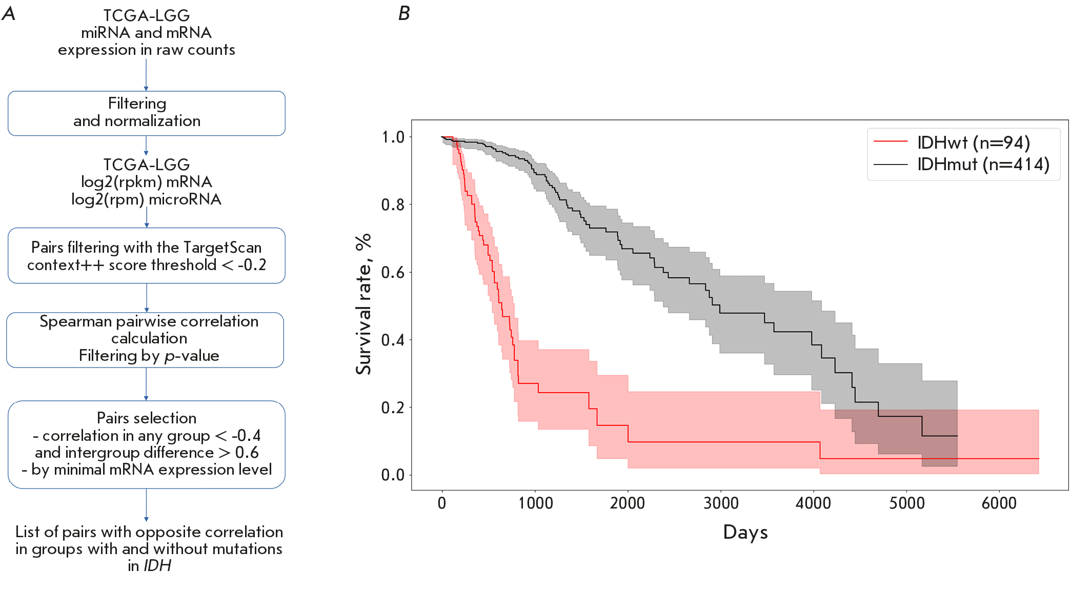 There is intense clinical research under way into LGGs; however, comprehensive analysis of large-scale cohorts involving sequencing of tumor DNA and patients’ DNA, as well as analysis of gene expression and DNA methylation, is virtually nonexistent. The only study of TGG samples collected from 530 patients has been deposited into the Cancer Genome Atlas (TCGA) (https://portal.gdc.cancer.gov/). We performed pre-filtering of all the possible pairs for microRNA–mRNA interactions obtained both experimentally and in silico across the existing databases. TargetScanHuman 8.0 (https://www.targetscan.org) for finding mRNA targets of microRNAs was used as the main database. At the second stage, we calculated the correlation of expression between protein-coding mRNAs and all the microRNAs. Pairs for which Spearman’s correlation coefficient was < -0.4 in any of the groups (IDHwt or IDHmut), which corresponds to a strong negative correlation (namely, significant effect of this microRNA on gene expression), were considered significant. The absolute difference in intergroup correlation coefficients should be ≥ 0.6.