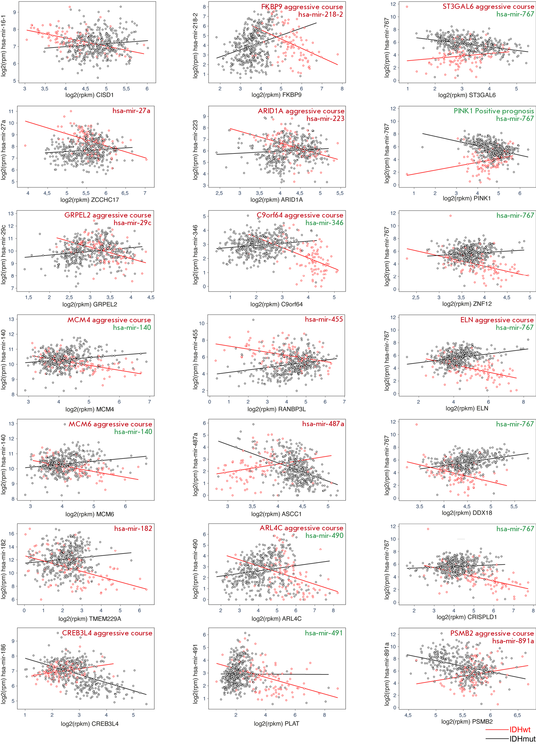 Fig. 2. Graphs of microRNA–mRNA correlations for 21 pairs. Black is the IDHmut group; red is the IDHwt group. Expression levels for each patient and linear regression for each group are shown. mRNAs and microRNAs associated with a negative prognosis of MN are marked in red; protective ones, in green. RPM – reads per million mapped reads; RPKM – reads per kilobase per million mapped reads
