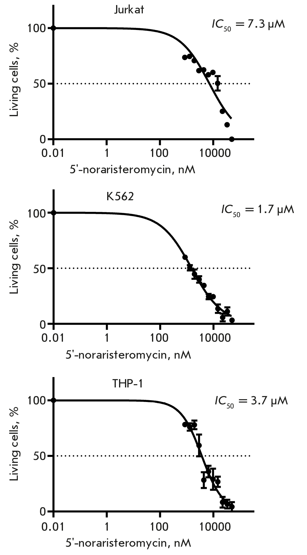 To assess the cytotoxic activity of 5'-noraristeromycin on the THP-1, Jurkat, and K562 leukemia cells, they were seeded into the wells of a 96-well plate (2,500, 2,000, and 2,500 cells per well, respectively). The cells were then treated with the drug within a broad range of concentrations (0.86–50 µM). DMSO at a concentration of 0.25% per well (corresponding to the percentage of DMSO when administering the drug at maximum concentration) was used as the control. The total volume of the well was 100 µL. The cells were incubated for 72 h. Cell survival was evaluated using a Resazurin Cytotoxicity Assay Kit (CEL-04-4-30 ML) (Abisense, Russia). Resazurin was added to PBS at a 1 : 100 ratio (volume, 100 µL) and incubated at +37°C in the presence of 5% CO2 for 4 h. Absorbance was then measured (absorbance at 570 nm; reference wavelength, 620 nm) using an Multiskan FC microplate photometer (ThermoScientific, USA). The average signal for the wells containing the medium only was subtracted from the value recorded for each well. Next, the data obtained regarding the concentration were normalized to the control and the IC50 value (half-maximal inhibitory concentration) was calculated using nonlinear regression. At least three replicates were made for each concentration. The IC50 value was calculated, and diagrams showing the dependence of living cells on drug concentration were plotted using the GraphPad Prism software v.8.4.3 (GraphPad Software, San Diego, USA).