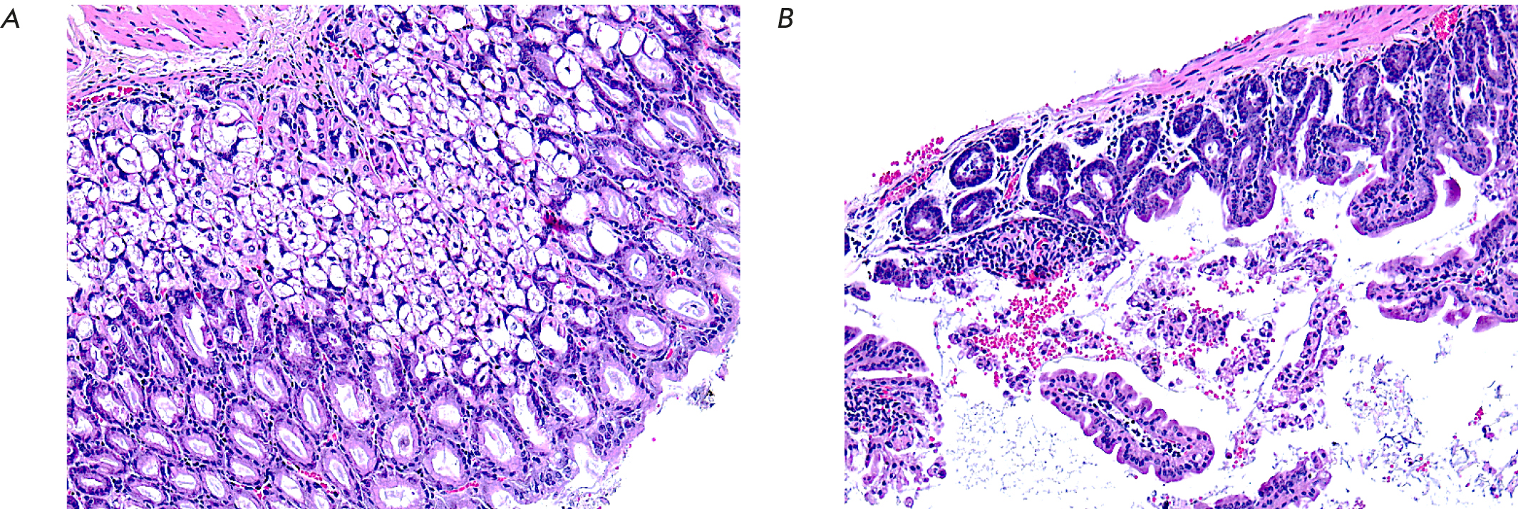 Fig. 2. A fragment of the mucous membrane of the wall of the stomach (A) and small intestine (B) in an experimental mouse after administration of 80 mg/kg 5'-noraristeromycin. Hematoxylin–eosin staining. 200× magnification