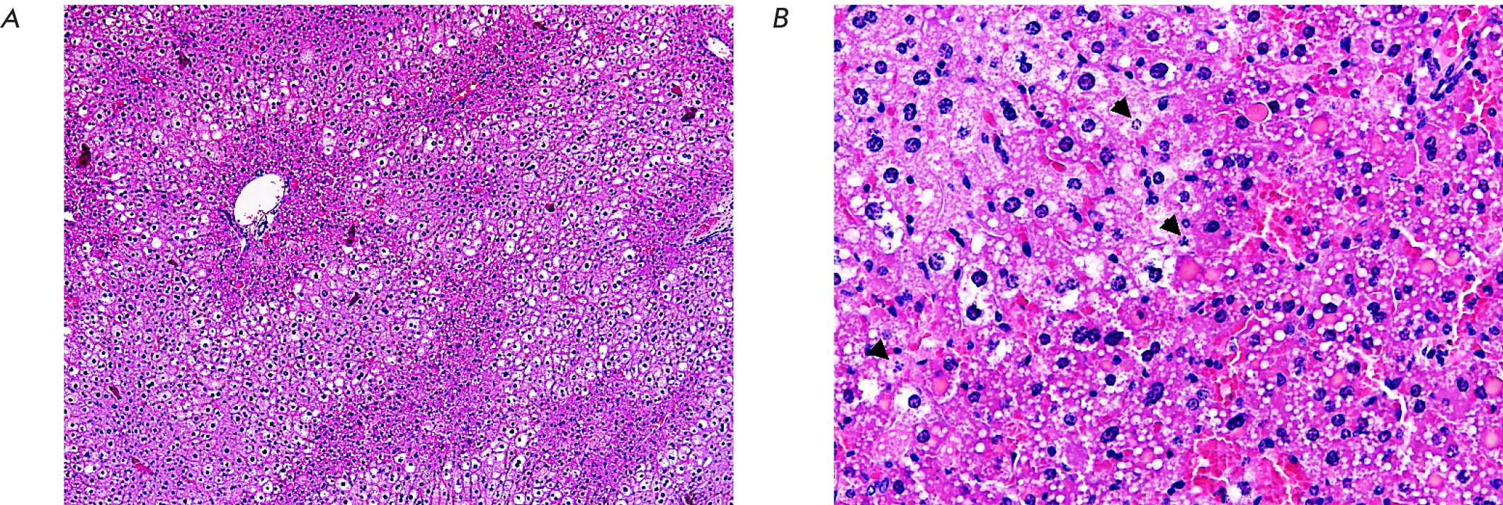 Fig. 3. A fragment of liver tissue from an experimental mouse after administration of 80 mg/kg 5'-noraristeromycin. The hepatocytes with a fragmented nucleus are apoptotic cells (shown with an arrow); round cells with homogeneous cytoplasm are necrotic cells. Hematoxylin–eosin staining. Magnification ×100 (A); ×400 (B)