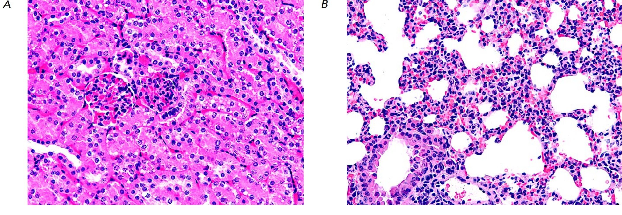 Fig. 5. A fragment of kidney (A) and lung (B) tissue from an experimental mouse after administration of 80 mg/kg 5'-noraristeromycin. Hematoxylin–eosin staining. 400× magnification
