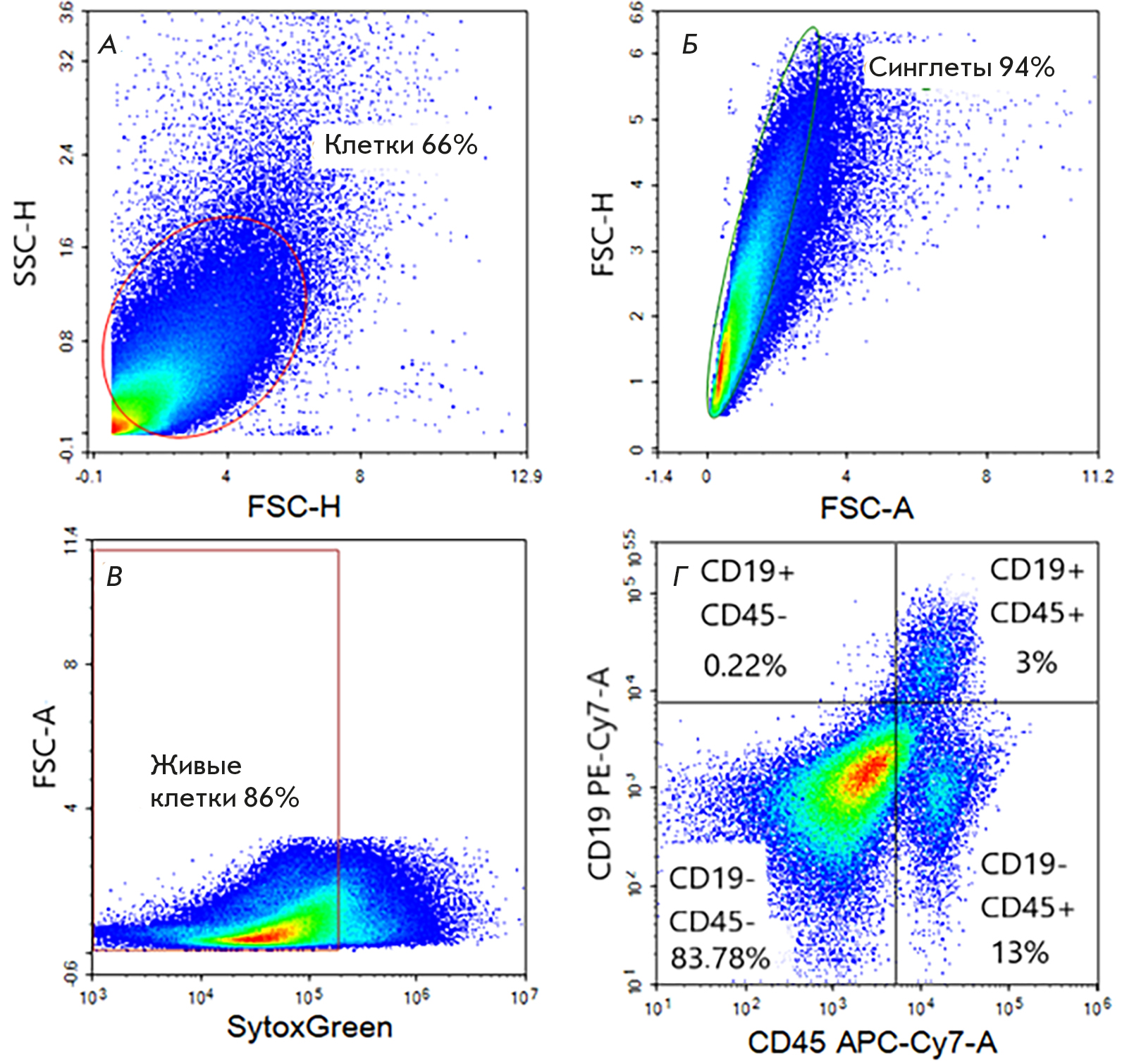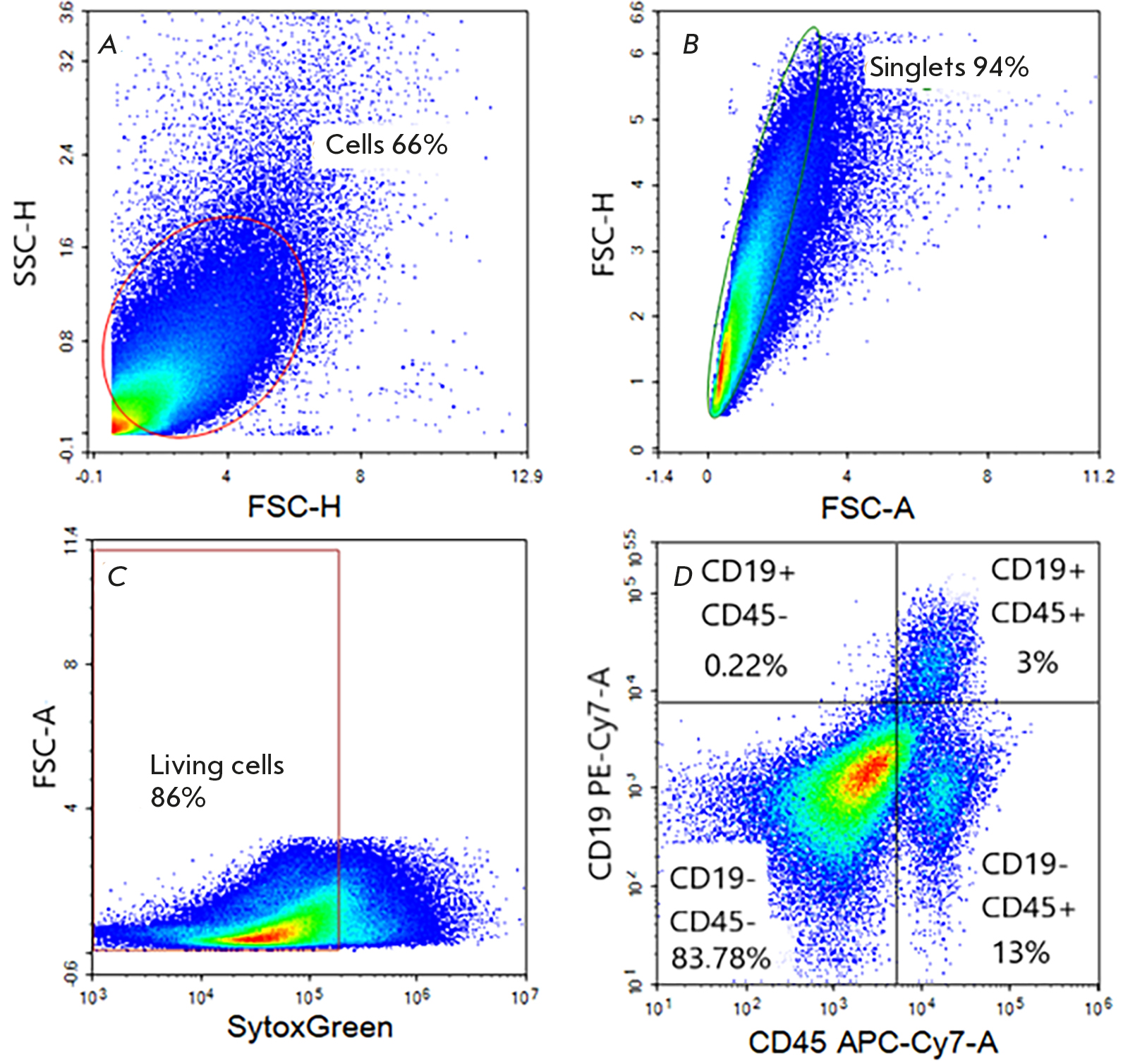 To identify and quantify the B cell population, reflecting the degree of tumor tissue infiltration, all samples were analyzed by flow cytometry (Fig. 2). Staining was performed using monoclonal anti-human common leukocyte antigen CD45 antibodies conjugated with APC-Cy7 (CD45 APC-Cy7) and anti-human B lymphocyte antigen CD19 antibodies conjugated with PE-Cy7 (CD19 PE-Cy7). At the first step, a tumor cell population was identified in the forward scatter (FSC) versus side scatter (SSC) dot plot (Fig. 2A). Then, single cells were separated from cell aggregates that could be the source of redundant fluorescence signals in further quantification of B cells (Fig. 2B). At the second stage, living cells were gated among single cells (Fig. 2C) by staining with a fluorescent dye, SytoxGreen, that has high affinity for nucleic acids. The dye penetrates only into cells with damaged plasma membranes, so it is used to assess cell viability. Then, four subsets were identified among the living cells based on staining with specific antibodies to the surface antigens CD45 and CD19, where the gate with double positive staining corresponded to B cells (Fig. 2D).