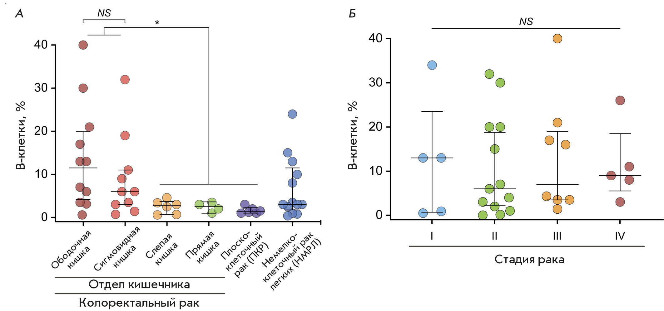 Fig. 3. (A) Quantification of tumor-infiltrating B cells in tumor material of various nosologies. (B) Abundance of tumor-infiltrating B cells in colon cancer samples, depending on the stage. Statistical analysis was performed using the nonparametric Mann–Whitney U test. *P < 0.05; NS – no significant difference