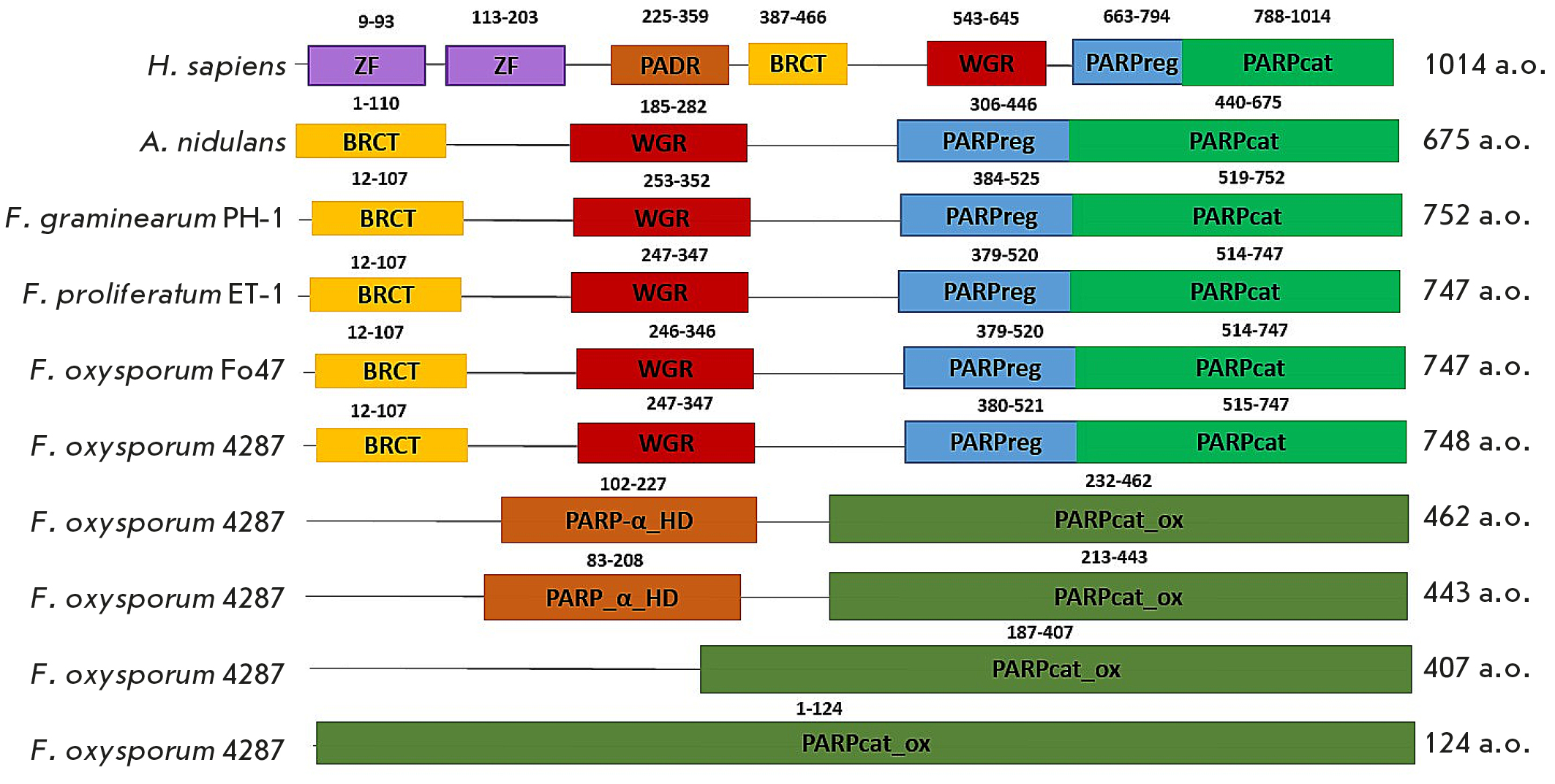In the present work, we searched for homologs of PARP and its antagonist PARG using databases containing whole genome structures of fungi of the Fusarium genus with predicted translation products. In each of the four studied genomes, we found approximately 750 aa PARP1 and PrpA homologs possessing a universal structure: BRCT and WGR domains at the N-terminus and regulatory and catalytic domains at the C-terminus. Unlike human PARP1, the fungal enzymes lacked a N-terminal regulatory domain containing the zinc finger motifs responsible for the search for and recognition of DNA damage and PARP binding to it, which may be an indication of their greater relation to human PARP2, which also lacks these structures [15], than to PARP1. In this regard, the question of how fungal PARPs bind to DNA and perform repair remains open. Possible alternatives to zinc fingers may be involvement of the WGR domain [20] or the use of an intermediary protein in the binding process. One of the most interesting results of the study was the identification, in addition to the “main” PARP homolog, of four proteins containing the catalytic domain, but lacking the WGR and BRCT domains in the F. oxysporum f. sp. lycopersici 4287 strain. Further search in the database using the BLASTp algorithm revealed that proteins containing the catalytic domain and structurally similar to the “additional” PARPs found in strain 4287 were also present in other Fusarium strains, primarily in F. oxysporum. This species is very plastic; in addition to the main (core) chromosomes, its genome can also contain additional chromosomes that often carry genes associated with pathogenicity and specificity to specific host plants [51, 52]. Probably, fungi have acquired “additional” proteins containing PARP catalytic domains independently of the “main” ones through horizontal gene transfer, whose indirect indication may be the presence of similar proteins in some plants, such as alfalfa or wheat. However, “additional” PARPs cannot completely duplicate the functions of the “main” ones due to the lack of a number of functionally significant domains in their structure. However, this does not equate to a functional inferiority of these proteins because what causes changes in the chromatin structure and nucleosome rearrangements may not be associated with the enzymatic activity of PARP [53].