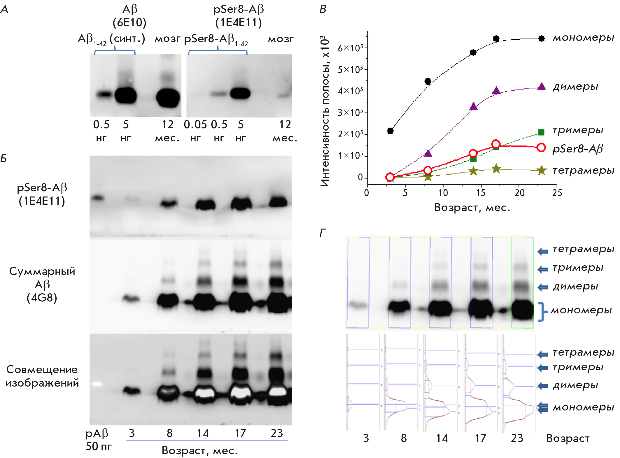 Рис. 1. Анализ динамики накопления pSer8-Aβ в сравнении с общим пулом пептидов Aβ методом Вестерн-блотинга в мозге мышей 5xFAD. А – накопление немодифицированных и pSer8-мономерных форм Aβ в мозге мыши в возрасте 12 месяцев; количество нанесенного образца соответствует 0.3 мг ткани мозга для Aβ и 1 мг ткани – для pSer8-Aβ. Б – сравнительный анализ накопления общего пула пептидов Aβ и pSer8-Aβ-форм в мозге мышей разного возраста; количество нанесенного образца соответствует 3 мг ткани мозга. В – графики, отображающие динамику накопления мономерных и олигомерных форм Aβ, по результатам обработки изображений в программе GeneTools. Г – анализ распределения интенсивности окрашивания полос в каждой дорожке при помощи GeneTools