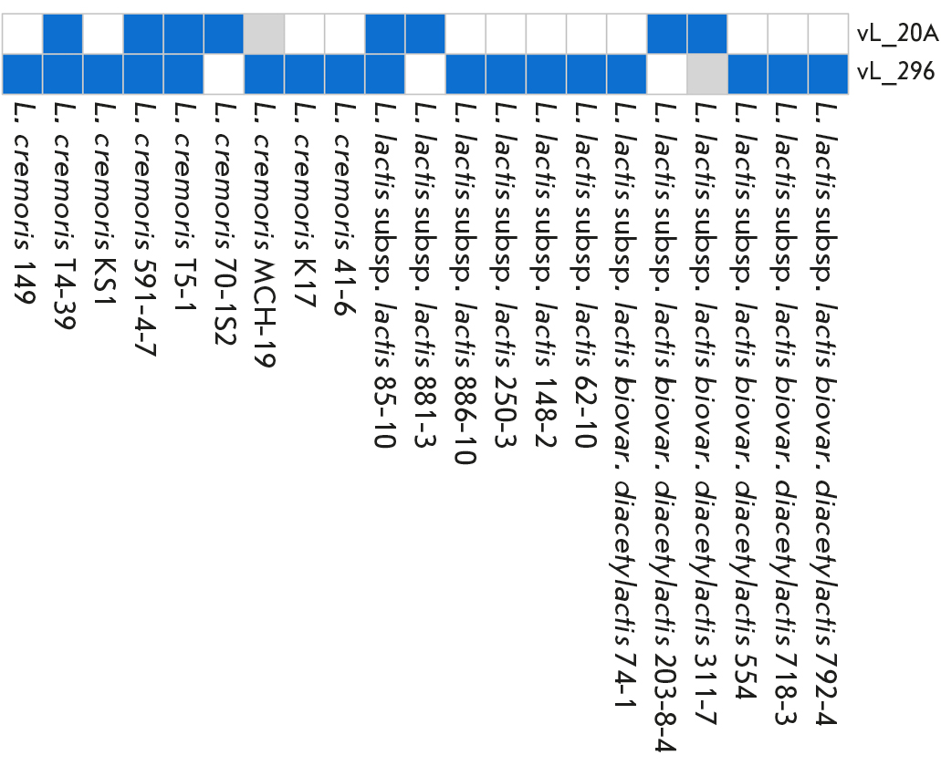 Литическая активность фагов vL_20A и vL_296 в отношении L. lactis subsp. lactis biovar. diacetylactis находилась на уровне 5.7% (2/35) и 14.3% (4/28) соответственно. Можно отметить, что фаги vL_20A и vL_296 обладают уникальными литическими спектрами. Из 21 выявленной бактерии-хозяине общими были только четыре (L. cremoris Т4-39, L. cremoris 591-4-7, L. cremoris T5-1, L. lactis subsp. lactis 85-10).