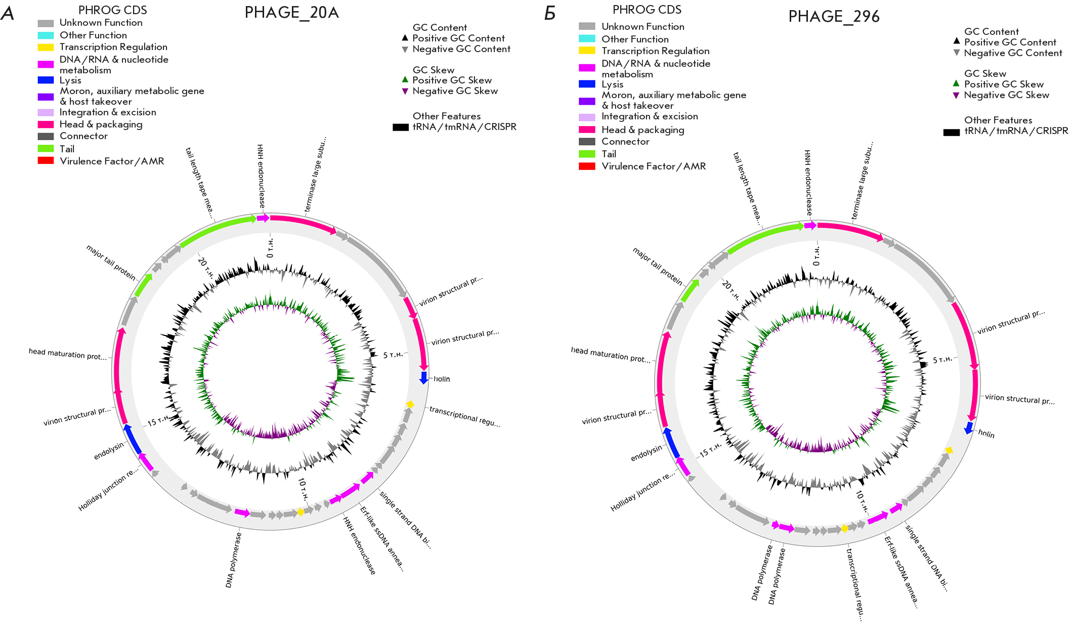 Рис. 3. Визуализация известных функциональных белков, кодируемых в геноме фагов L. lactis phage vL_20A (А) и L. lactis phage vL_296 (Б)
