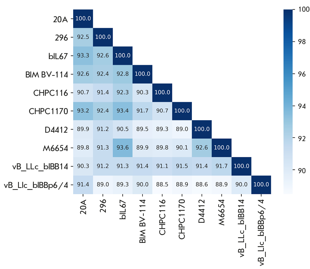 На рис. 4 представлены результаты оценки ANI геномов 10 наиболее генетически близких фагов из 254 проанализированных. Наиболее сходным с фагами vL_20A и vL_296 был L. phage bIL67 (ANI 93.3 и 92.6 соответственно). Необходимо отметить, что значение ANI при сравнении vL_20A и vL_296 было меньше, чем для вида L. phage bIL67 и составляет 92.5 (рис. 5). Можно предположить, что vL_20A и vL_296 являются представителями отдельных видов, не описанных ранее.