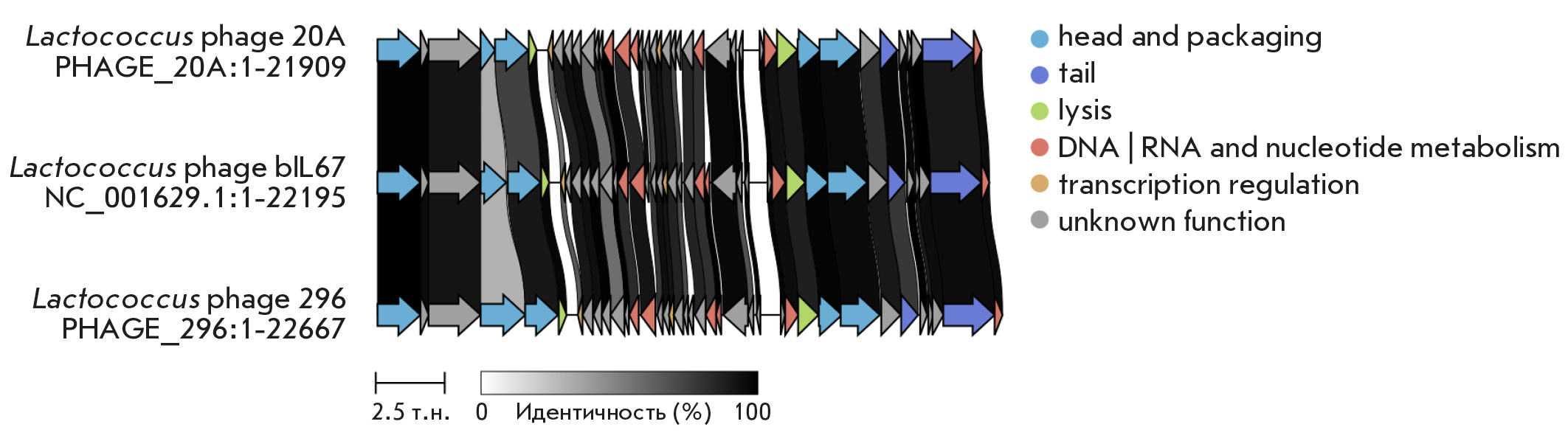 Рис. 5. Схема строения и гомологии геномов фагов L. phage bIL67, L. lactis phage vL_20A и L. lactis phage vL_296