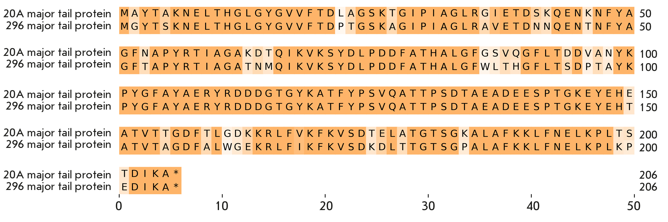 Рис. 6. Выравнивание аминокислотных последовательностей главного белка хвоста в геномах vL_20A и vL_296
