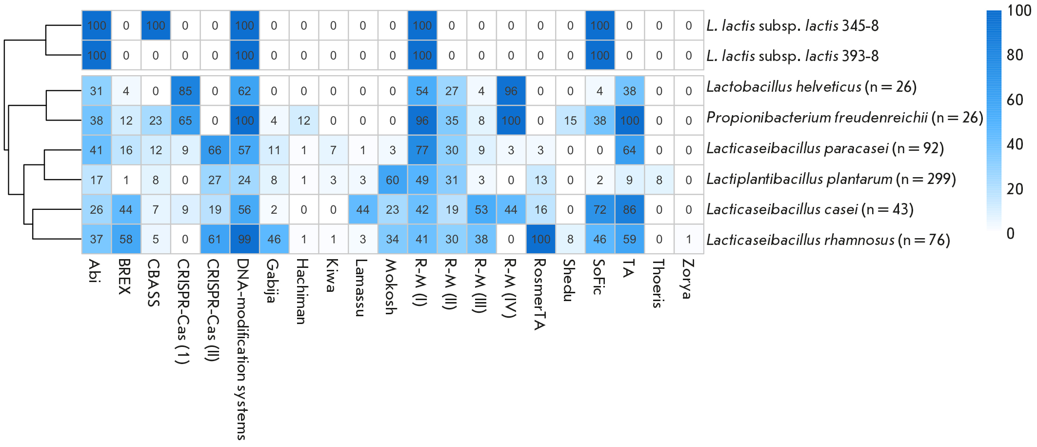 Рис. 7. Системы иммунитета молочнокислых бактерий. В ячейках указана частота встречаемости механизма иммунитета у представителей заквасочных культур. В названии рода указано число проанализированных геномов