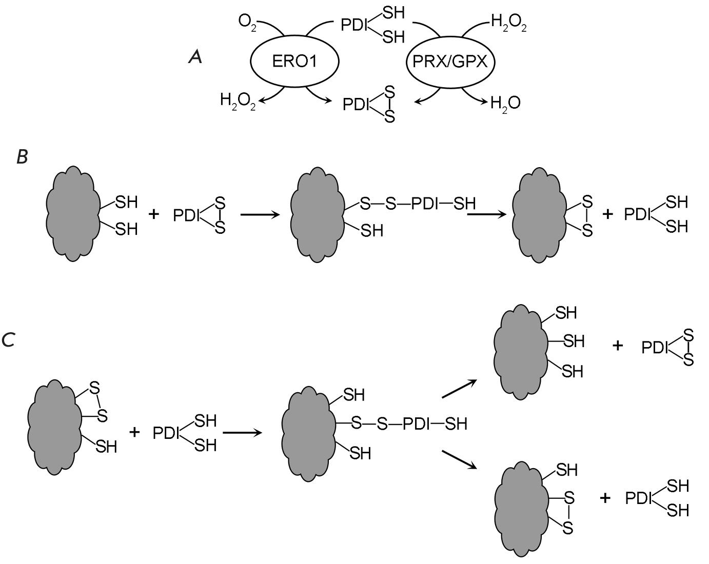 Fig. 8. Oxidative folding of proteins in the endoplasmic reticulum lumen. (A) Oxidation of protein disulfide isomerase (PDI) under the action of thiol oxidase (ERO1) and thiol peroxidases (PRX and GPX), (B) Formation of disulfide bonds by the oxidized form of PDI, (C) Isomerization and reduction of disulfide bonds by the reduced form of PDI