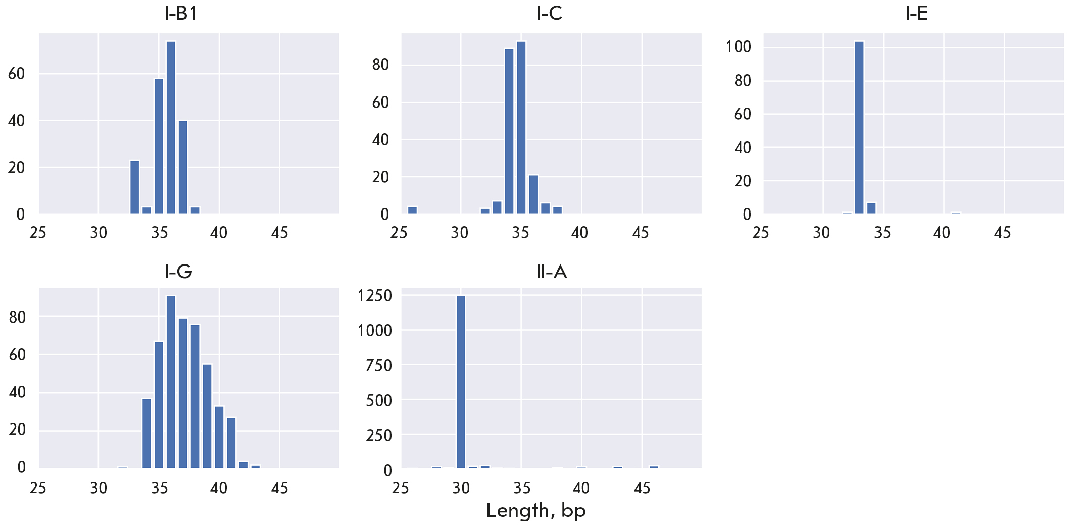 Fig. 2. Distribution of Predicted Spacer Lengths by CRISPR-Cas Subtypes