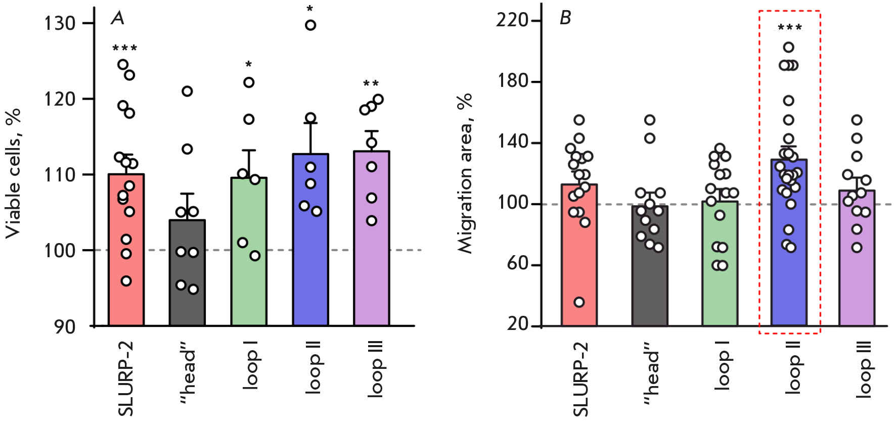 Previously, SLURP-2 was shown to enhance the migration of Het-1A keratinocytes via interaction with α7-nAChR [18]. In the present work, we studied the effects of SLURP-2 and its peptide mimetics on the migration of HaCaT skin keratinocytes. SLURP-2, loops I and III, and the “head” were found not to exert a significant effect on the migration of HaCaT keratinocytes (Fig. 2B) in a scratch closure model. In this case, loop II accelerated keratinocyte migration by ~30% (Fig. 2B). Probably, SLURP-2, interacting with different acetylcholine receptor subtypes, is able to both increase and decrease cell migration, with the overall effect dependent on the expression of certain receptors in specific cells.